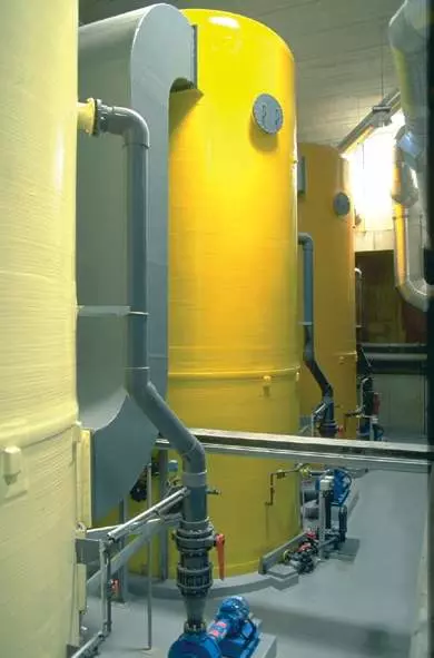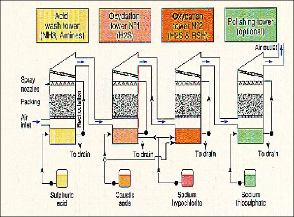 - The second and third, operated in basic conditions (pH 9 and pH 11), with the addition of an oxidant, are dedicated to the removal of sulfide compounds (H₂S, Mercaptans...). When the hydrogen sulfide content of the gaseous effluent is not too high, one tower of this type may be sufficient.