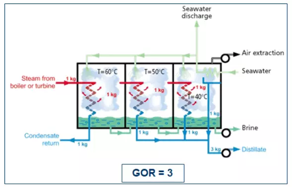 - The thermal efficiency of a unit is quantified by the Gain Output Ratio (GOR) defined as the quantity of distillate produced per unit of heating steam used