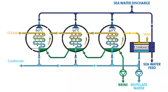 - At the outlet of the condenser, part of the warmed sea water is used as make-up of the unit, and part rejected to the sea. Brine and distillate are collected from cell to cell till the last one from where they are extracted by centrifugal pumps